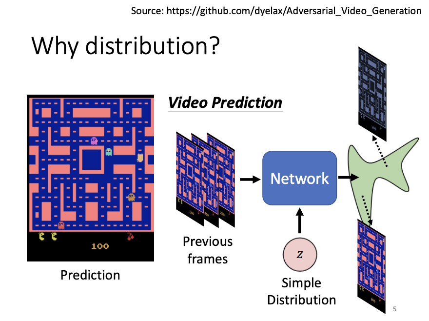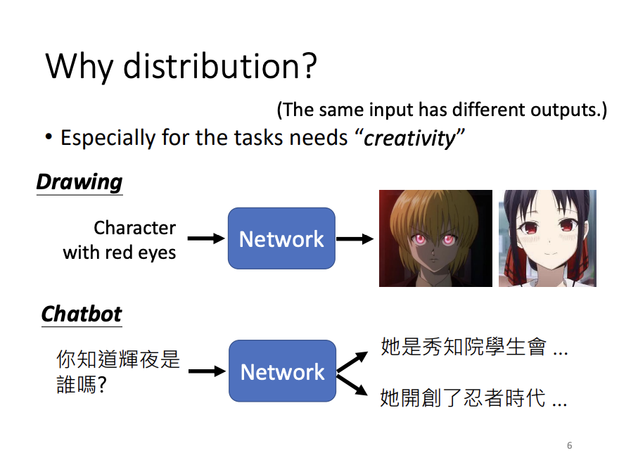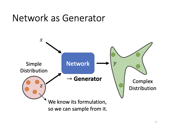 It’s common for neural networks to output values, vectors, or sequences for tasks such as classification or regression. Beyond this, networks can also be designed as generators to produce generative outputs. Unlike typical neural networks, a generative network receives not only an input but also a random value sampled from a simple distribution. What is unique about generative networks is that, unlike conventional networks where a consistent input always results in a fixed output, the generator can produce varied outputs from the same input due to the incorporation of the random component. This randomness results in a complex output distribution.