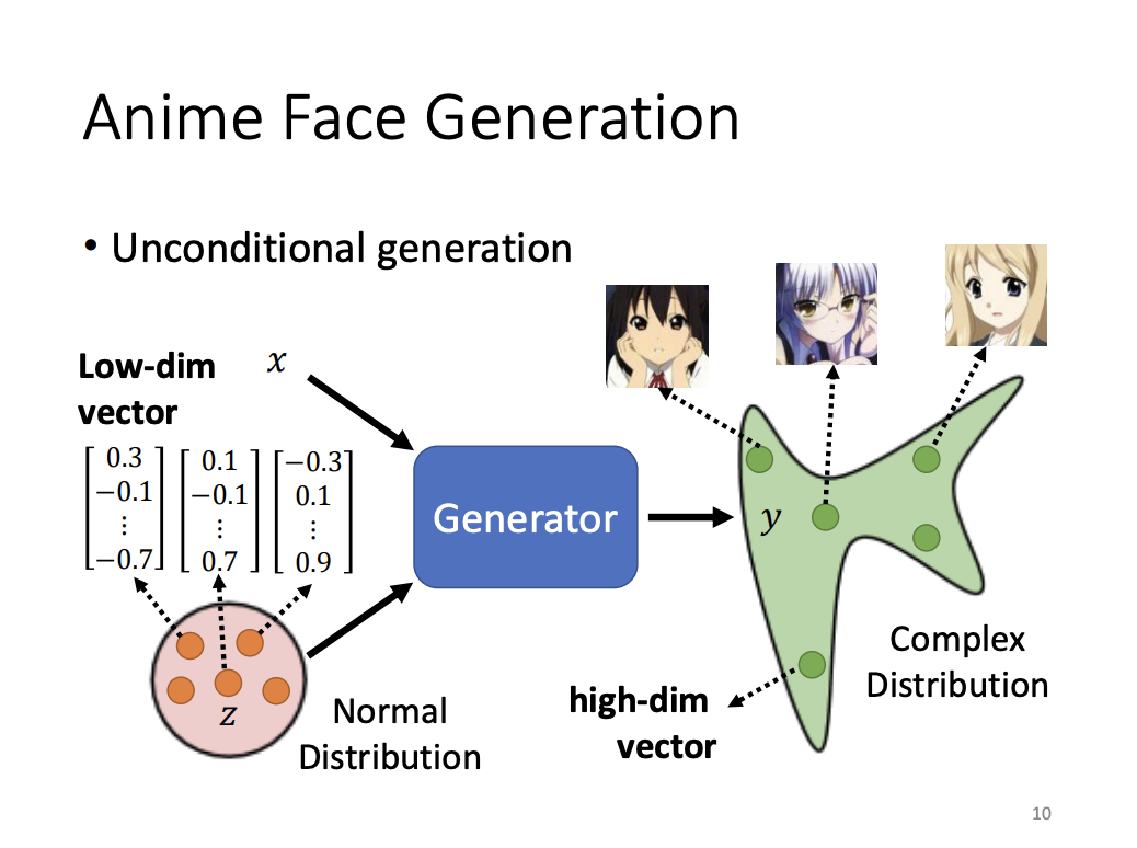 Generative models can be categorized into conditional and unconditional generation, depending on whether an input vector is fed into the network alongside the random component. In unconditional generation, such as in anime face generation, the generator receives a low-dimensional vector sampled from a standard distribution and outputs a high-dimensional vector representing an image. This process collectively forms a complex distribution that captures a wide range of possible outputs.