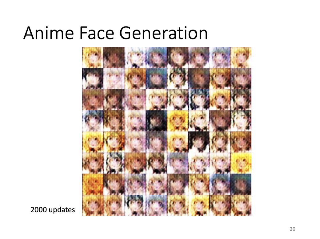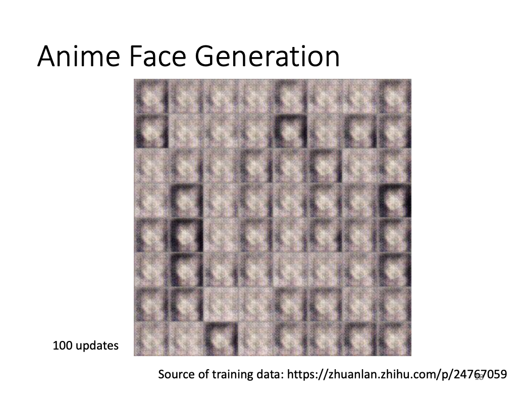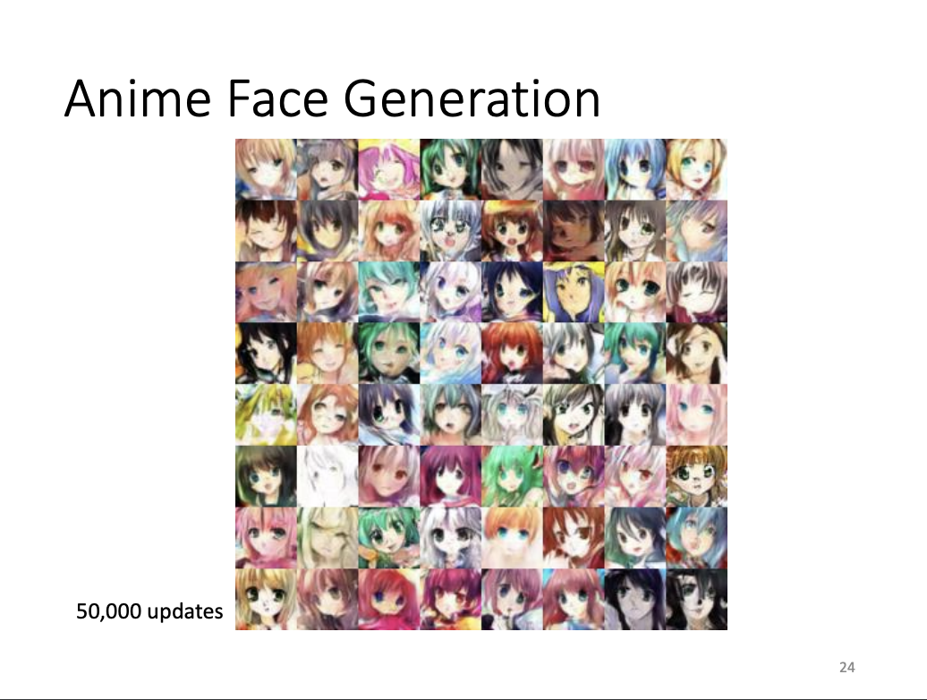 - Anime face generation at 100 updates, 2000 updates, and 50000 updates.