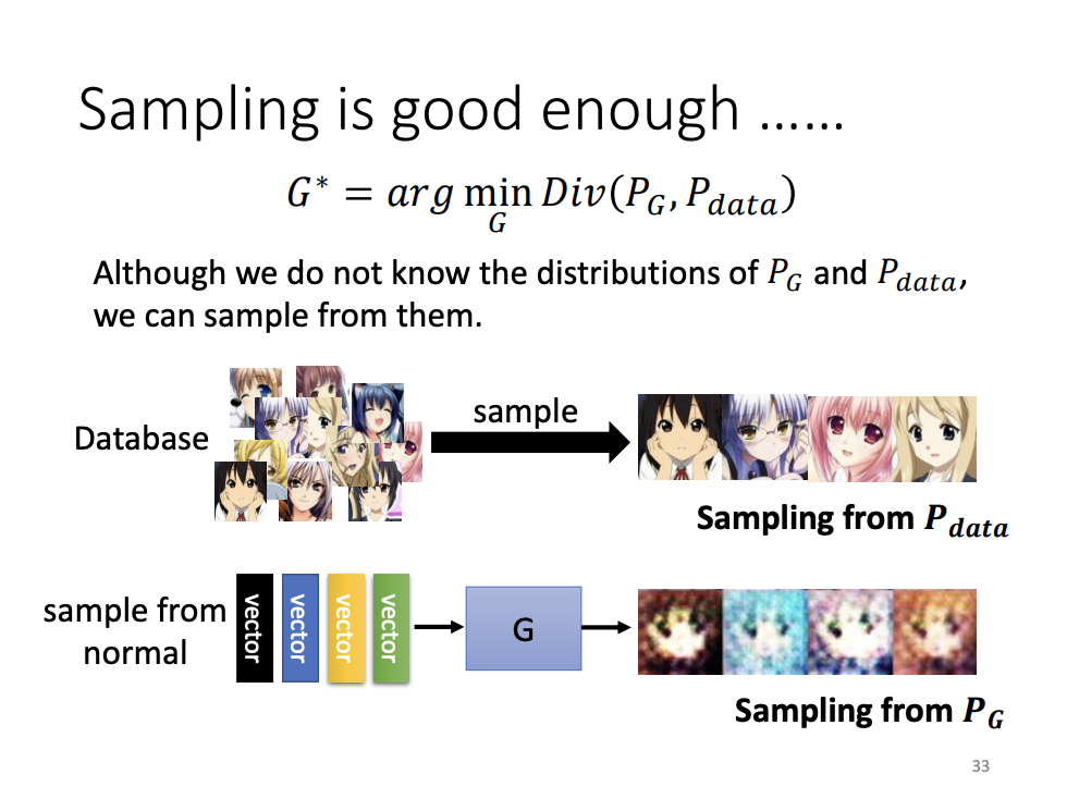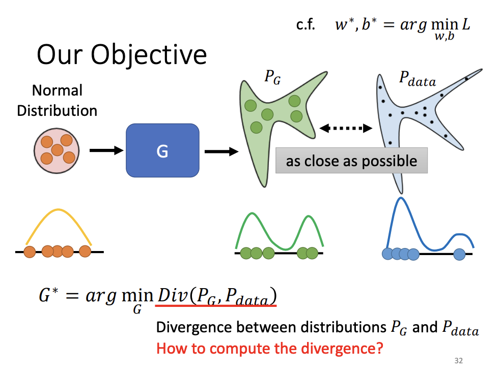 The goal of the generator is to make the generated distribution as close as possible to the real data distribution, minimizing divergence. However, directly computing the divergence between two complex distributions is challenging. GANs address this by sampling data from both distributions and estimating divergence based on these samples. The discriminator acts as a binary classifier, trained to distinguish between real and generated samples.