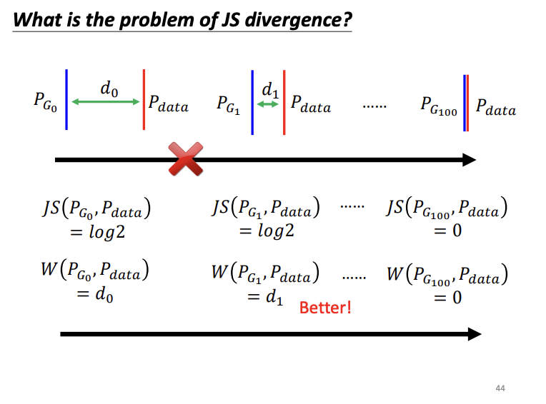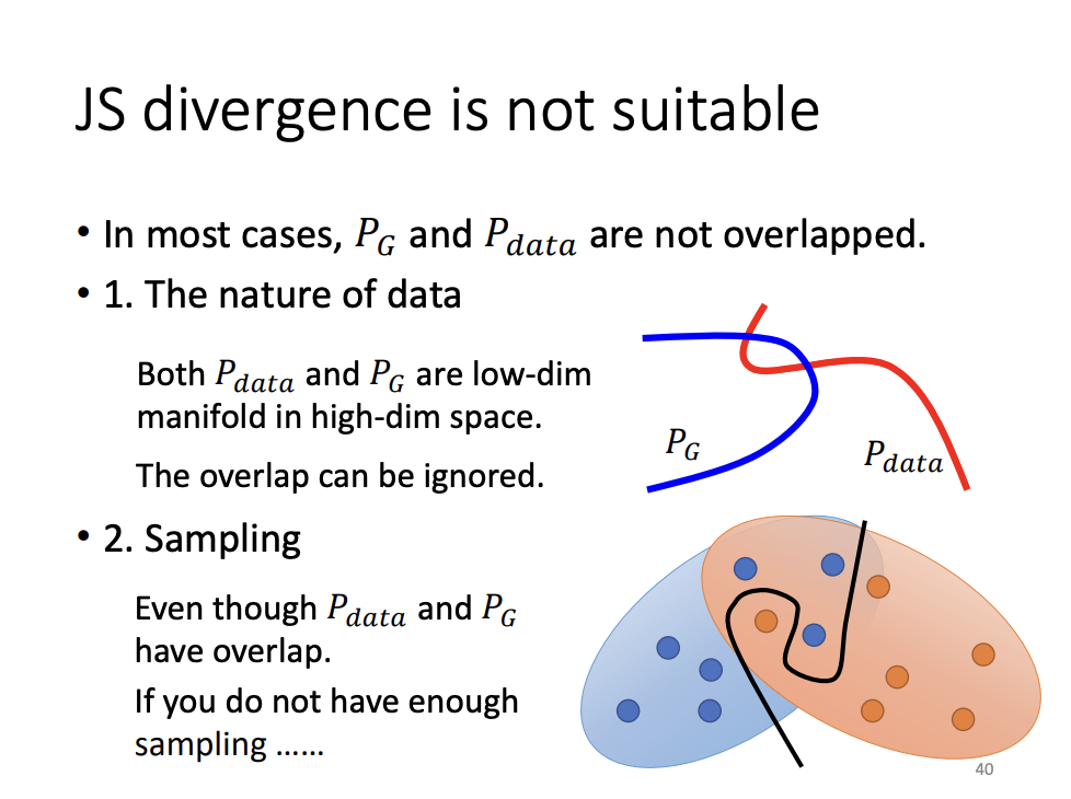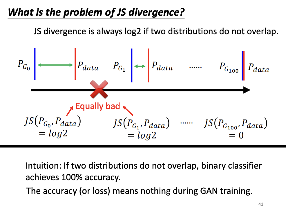The original GAN employs Jensen-Shannon (JS) divergence to measure the difference between the generated and real data distributions. However, JS divergence has limitations, especially when the two distributions do not overlap. In such cases, the JS divergence is always log2, regardless of how close the distributions might actually be. This issue makes optimization challenging during training.