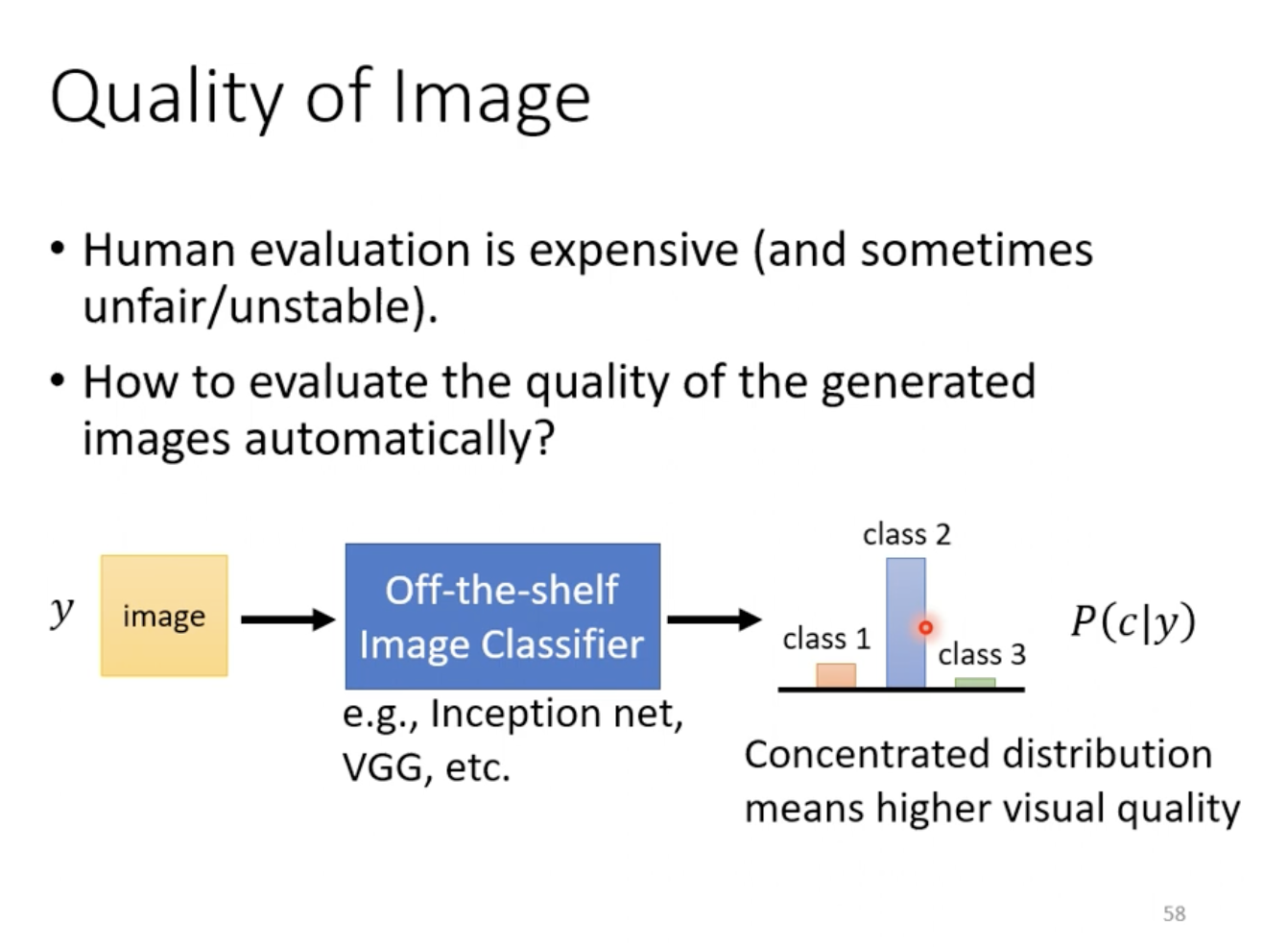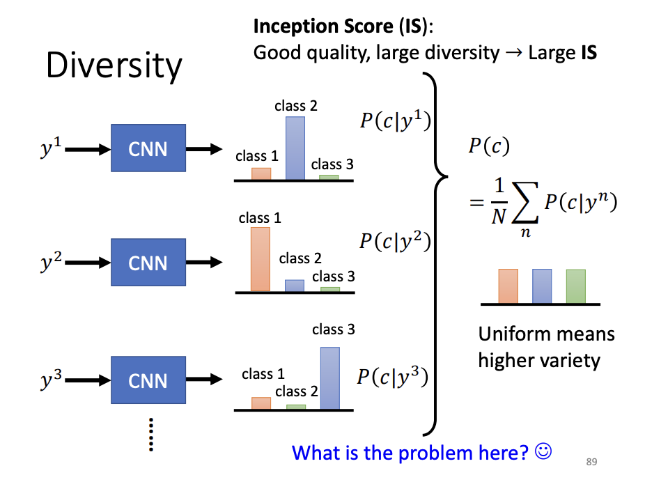 Assessing the quality of GAN-generated images through human evaluation is costly, and usually automated methods are preferred. One approach is to use an image classifier to evaluate the generated images. If the output distribution of the classifier is concentrated, it indicates higher visual quality. However, this method does not address the problem of mode collapse, where the generator produces limited variations of the same image. In practice, when encountering mode collapse, the model version prior to the collapse is often used to mitigate the issue. Another related problem is mode dropping, where the generated distribution fails to cover certain parts of the real distribution, even though diversity is seemingly maintained.