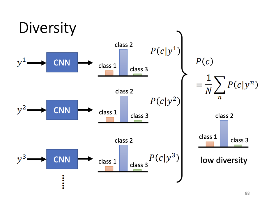 To evaluate the diversity of GAN-generated images, an image classifier can be employed to classify each generated image, and the resulting distributions are averaged. If the averaged distribution is concentrated, it suggests insufficient diversity in the generated samples.