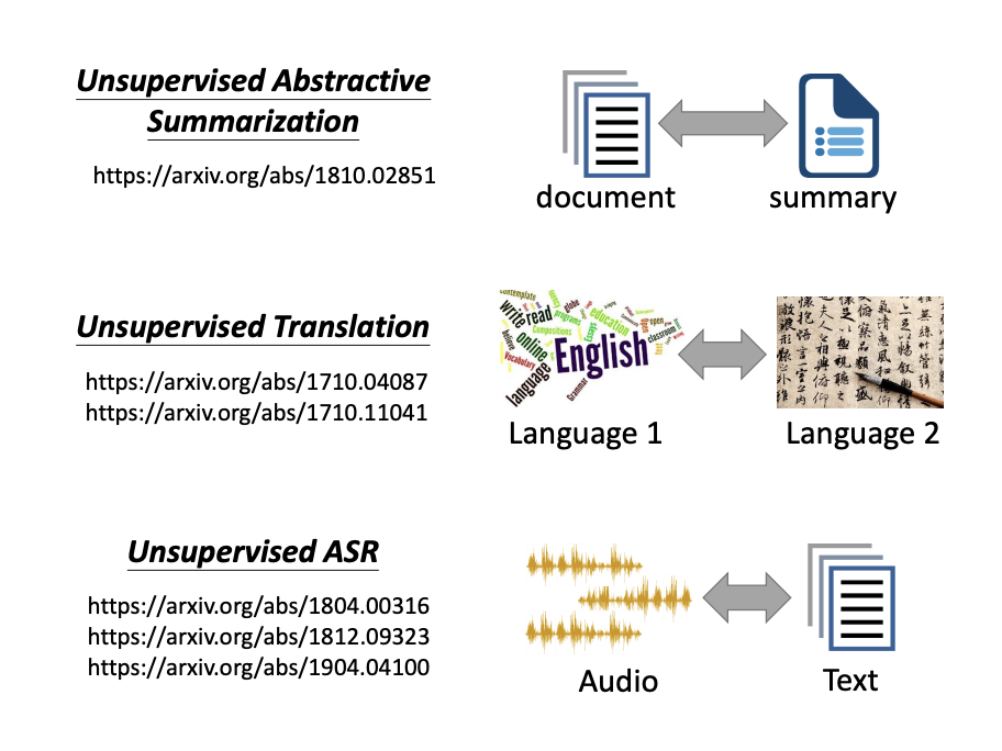 In unsupervised learning, similar techniques can be applied to tasks like unsupervised abstractive summarization, unsupervised translation, and unsupervised automatic speech recognition (ASR).