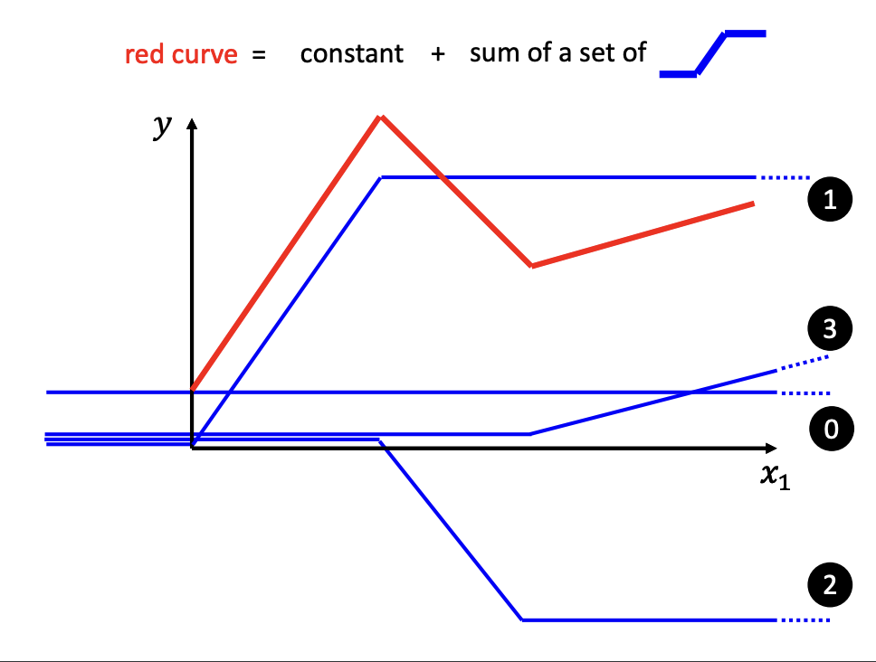 - $y = b + \sum_{i}^{}c_i * sigmoid(b_i + w_i * x)$