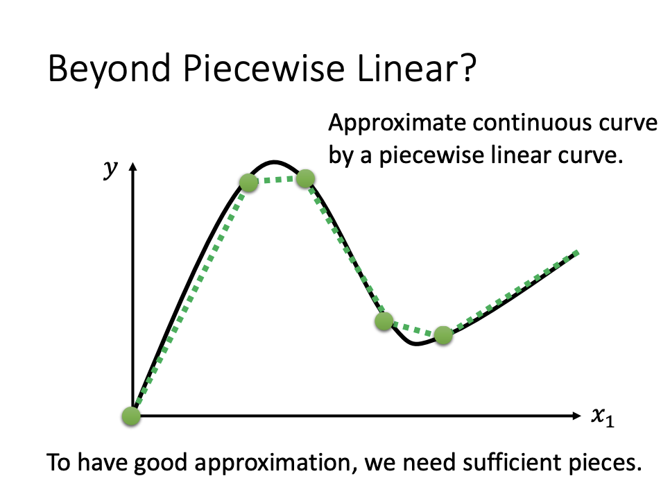 A piecewise linear curve is formed by combining multiple linear segments. This approach allows for the approximation of complex curves, as illustrated in the accompanying image.