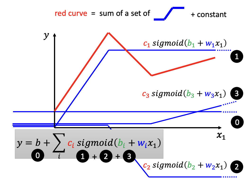 - $y = b + \sum_{i}^{}c_i * sigmoid(b_i + w_i * x)$