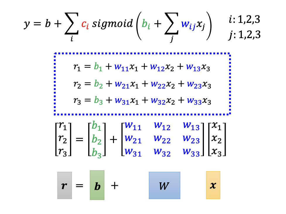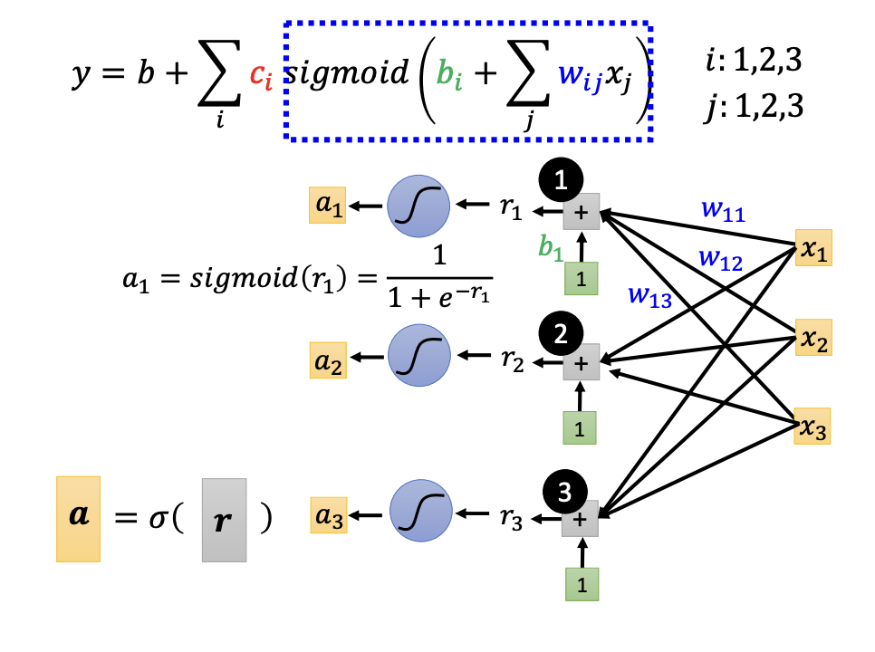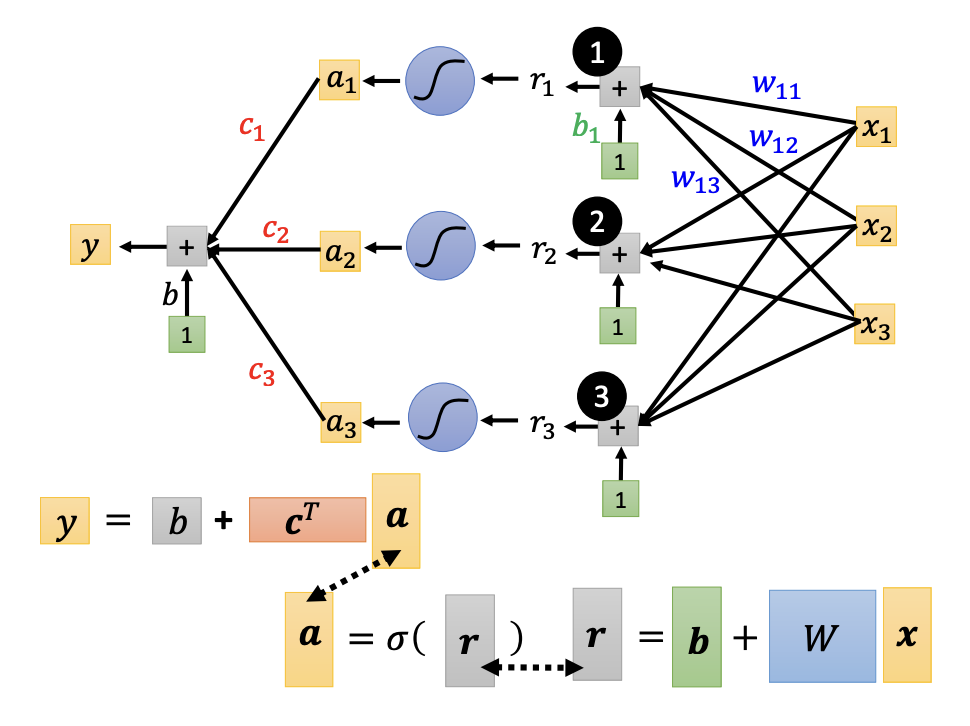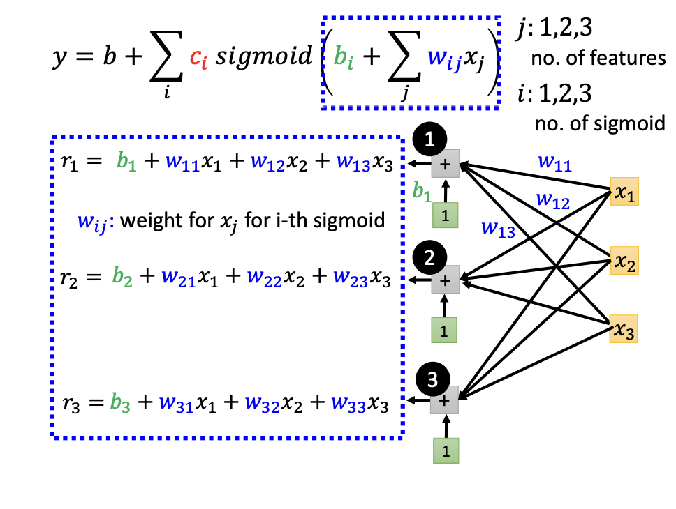 - $y = b + \sum_{i}^{}c_i * sigmoid(b_i + \sum_{j}^{} w_{ij} * x_j)$