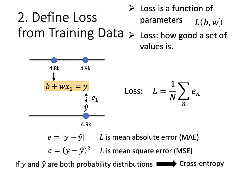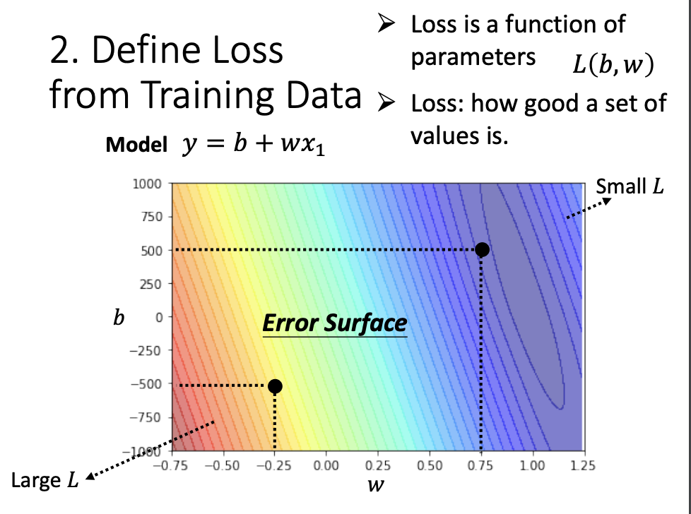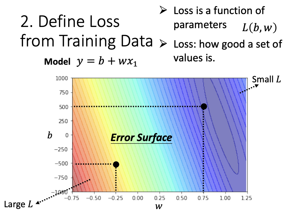 Loss is function of parameters, denoted as L(b, w). It describes how well a set of values compares with the training data. - Error Surface