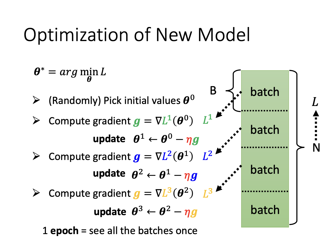 During the optimization of a model, a list of examples is used to adjust the parameters, typically processed in multiple iterations rather than all at once. In each iteration, a batch of examples is consumed, which is referred to as an update. Once all batches have been processed, it is termed an epoch.