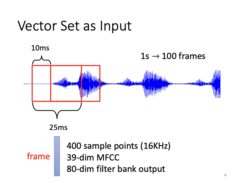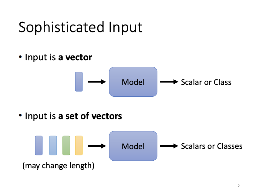 In machine learning models, the form of input can vary. It is not always a fixed-length vector, sometimes, it may be a set of vectors with varying lengths. For instance, in natural language processing, each word is often represented as a vector, and a sentence is treated as a sequence of such vectors. Similarly, in audio processing, a continuous audio signal is segmented into frames, each of which is represented as a vector.