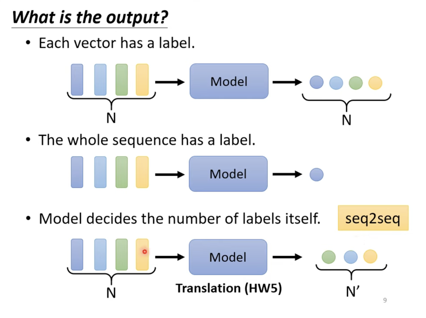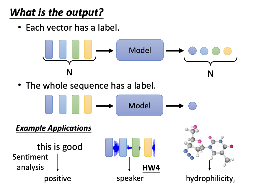 Likewise, the form of the output can differ depending on the task. In some cases, the model outputs the same number of labels as the input vectors (sequence labeling), as seen in tasks like part-of-speech (POS) tagging, where each word in a sentence receives a tag. In other cases, the model generates a single label for an entire sequence of vectors, such as in sentiment analysis, where the model determines whether the sentiment of a sentence is positive or negative, or in speaker recognition. Further more, in sequence-to-sequence (seq2seq) tasks, like machine translation, the model determines the number of output labels dynamically.