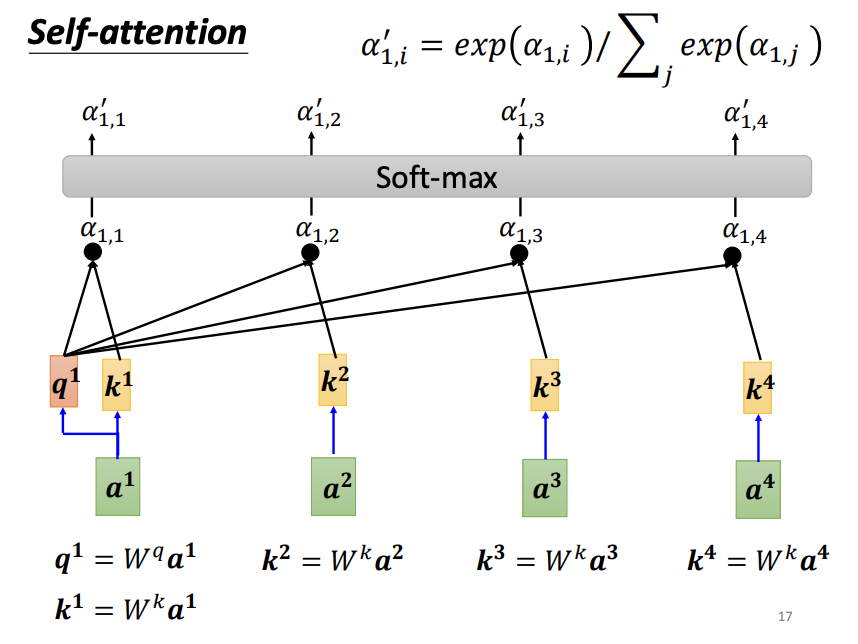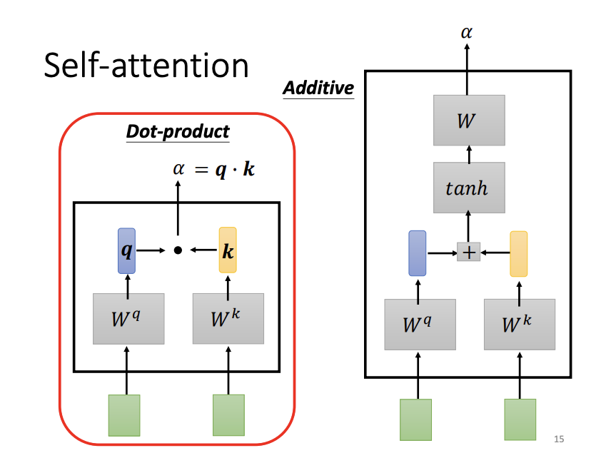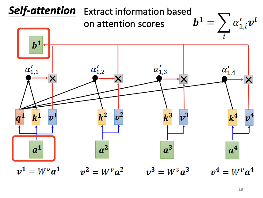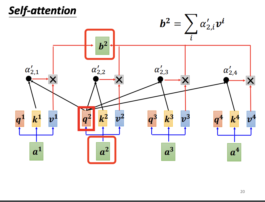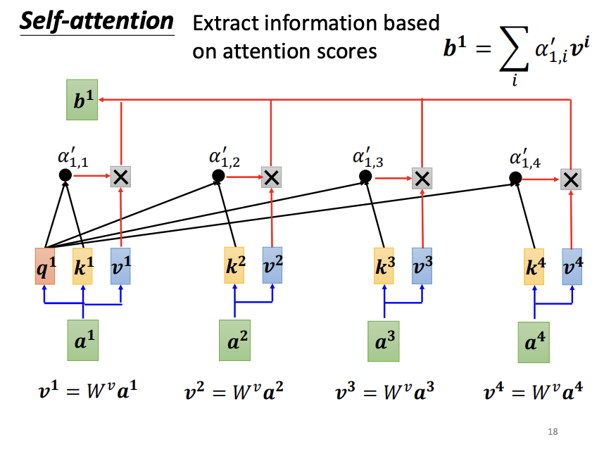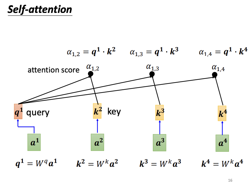 For each input vector, the self-attention mechanism evaluates its relevance to all other input vectors using the dot-product approach. Specifically, for a given input vector, a query matrix is applied to generate a query vector, while a key matrix is applied to the remaining input vectors to generate corresponding key vectors. The dot-product between the query vector and each key vector produces an attention score, which quantifies the relevance between the two vectors. Notably, an input vector also computes its relevance with itself. After calculating all attention scores, an activation function, such as softmax or ReLU, is typically applied for normalization. With these normalized attention scores, a value matrix (v matrix) is introduced to extract information from the input vectors. Each input vector is multiplied by the value matrix to produce a value vector, and the attention scores are then used to weight these value vectors. The weighted value vectors are summed to form the final output vector. If an input vector is highly relevant to others, it will have a greater influence on the resulting output vector.