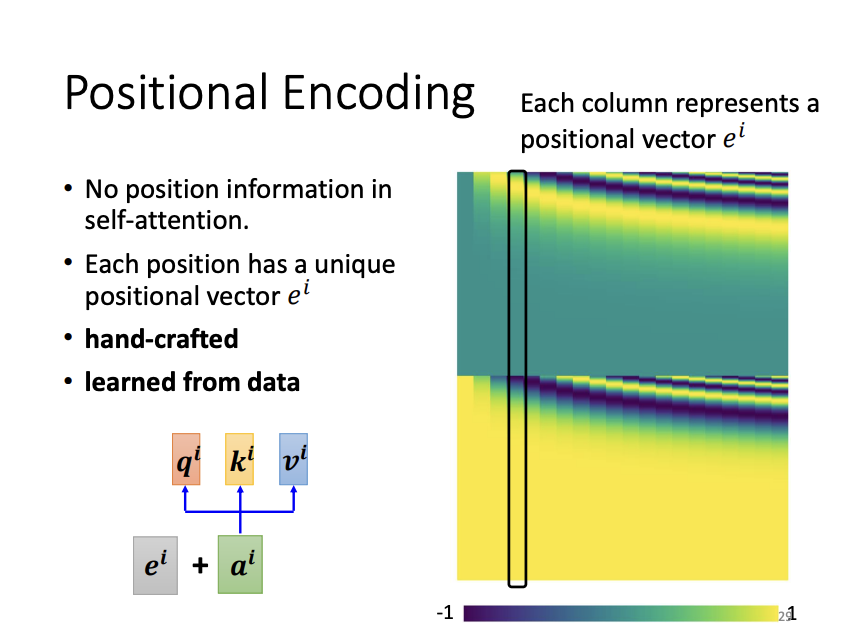 The basic self-attention mechanism does not inherently consider the order of the input vectors, which can be crucial in tasks where sequence structure is important. To address this, positional encoding is introduced. Positional encoding incorporates information about the position of each input vector by adding a unique positional vector to it. These positional vectors can either be hand-crafted or learned during training, enabling the model to capture sequential dependencies.