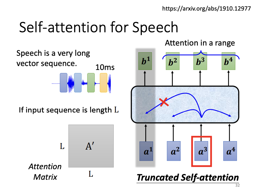Self-attention has become integral to many state-of-the-art models, such as Transformer and BERT. In speech processing, self-attention can be applied with certain optimizations. Since speech signals consist of long vector sequences, they result in large attention matrices, which can be difficult to train. Truncated self-attention addresses this issue by limiting the attention to a range of nearby vectors, leveraging domain knowledge that the content of an audio signal is often only relevant to its immediate context.