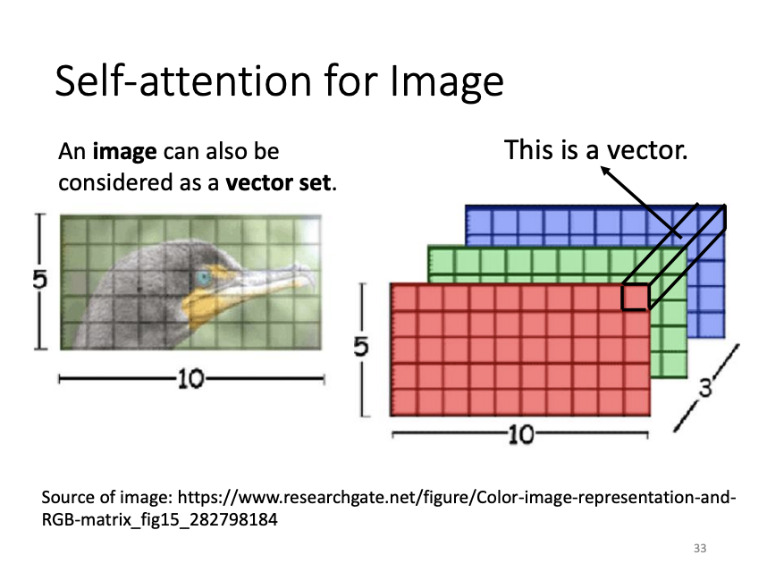 Self-attention can also be applied to image processing, where an image is treated as a set of vectors. Compared to convolutional neural networks (CNNs), self-attention is more flexible. While CNNs attend only to a fixed receptive field, defined by the user, self-attention dynamically attends to the relevant regions of the input based on learned attention scores. With appropriate parameter settings, self-attention can perform tasks similar to CNNs, but with greater adaptability.