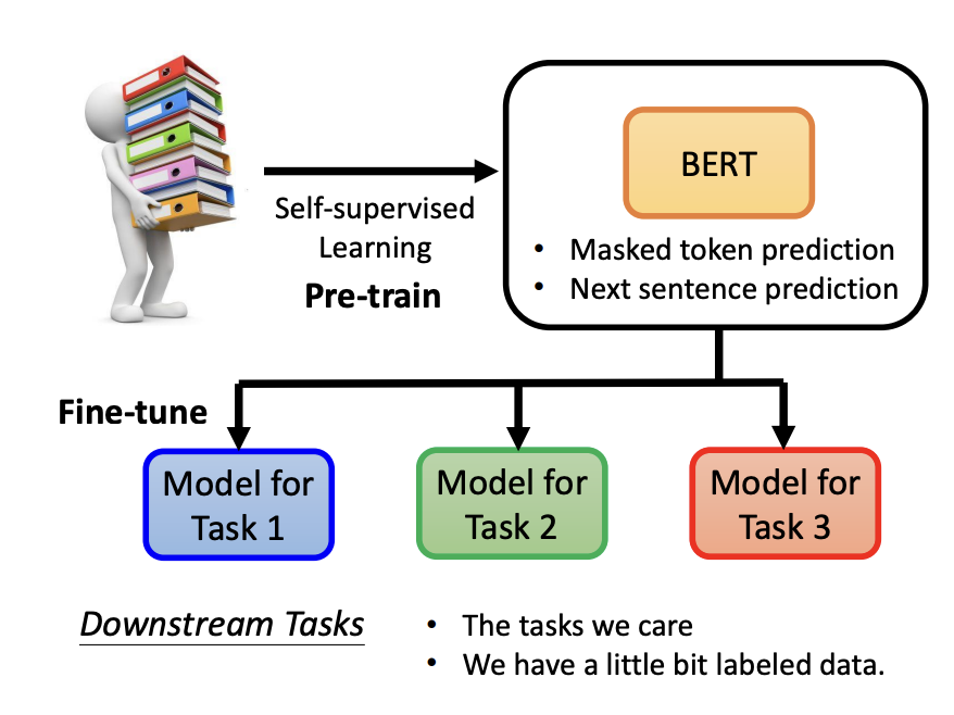 - Pre-training: BERT is trained on large-scale unlabeled data using self-supervised objectives.