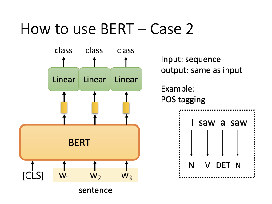 BERT can also handle tasks requiring token-level predictions, such as POS tagging. In this case, a pre-trained BERT model is fine-tuned with labeled data to produce sequence outputs matching the input sequence length, enabling accurate POS tagging.
