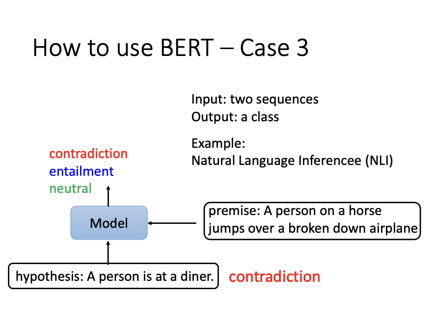 BERT is frequently used for NLI tasks, which involve determining the relationship between two sentences. For example, the model classifies whether the second sentence is a contradiction, entailment, or neutral relative to the first.