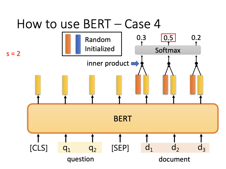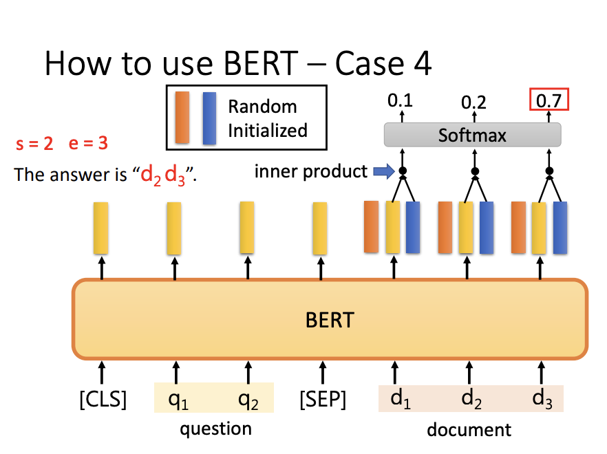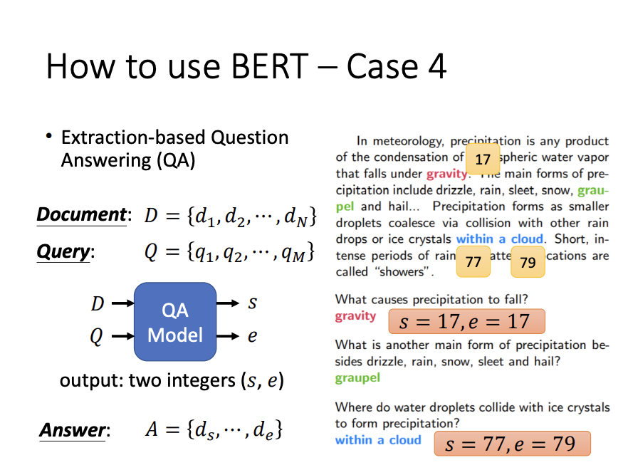 BERT is widely employed for extraction-based question answering. The process involves inputting a document sequence and a question sequence, and the model outputs two integers representing the start and end positions of the answer within the document. Two randomly initialized vectors are used to compute these positions. Each vector interacts with the output sequence from BERT, followed by a softmax operation to identify the positions with the highest confidence.