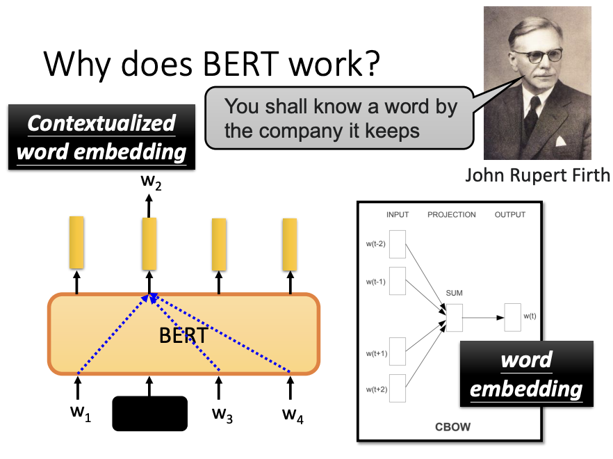 In linguistics, there is a well-established principle that the meaning of a word is determined by its surrounding context, often summarized as “the company it keeps.” BERT leverages this idea during training. By masking or replacing certain words and predicting them based on the surrounding context, BERT learns to extract contextual information effectively, enabling it to understand word meanings and relationships.